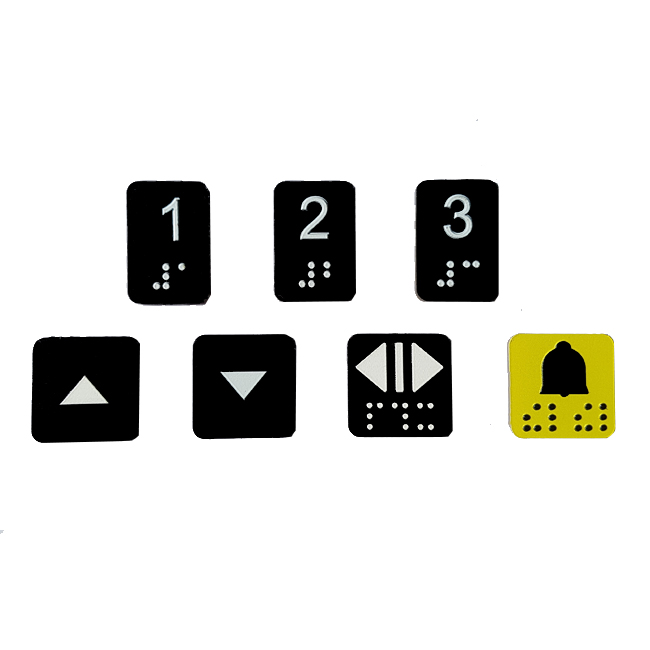לחצני ברייל למעליות, לחצנים מישושיים הכתובים עם אותיות ברייל ואותיות בעברית/מספרים עבור אנשים עם לקות ראייה ,הלחצנים מודבקים לצד כפתורי הלחיצה במעלית , מגיע ברקע שחור עם כיתוב לבן.