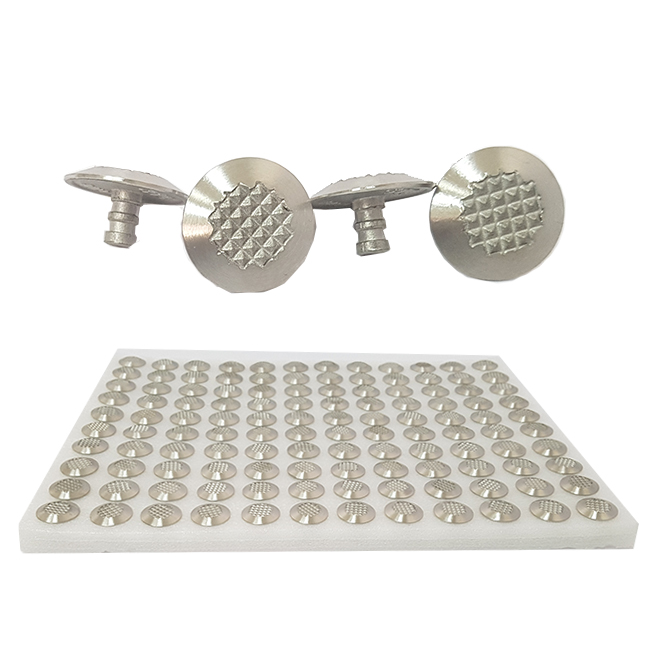 מסמרות נירוסטה בקידוח עם רגל סטנדרטית ראש שניצל בקוטר 25 מ”מ מיועדות ליצירת משטח אזהרה לפני גרם המדרגות . מסמרות  ומיועדות לשטחי פנים וחוץ להתקנה על גבי בשטחים בעייתים כגון: שטיח, גרנולית, שטחי חוץ וכד’